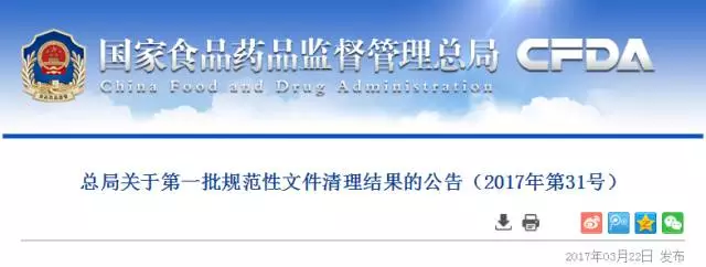 2017年3月22日,國家食品藥品監(jiān)管總局發(fā)布關于第一批規(guī)范性文件清理結(jié)果的公告(2017年第31號),2013年04月01日至2015年12月31日第一批175個規(guī)范文件繼續(xù)有效,22個規(guī)范文件廢止和宣布失效,其中涉及3個保健食品規(guī)范文件失效。