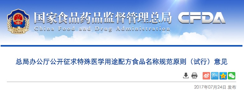 為做好特殊醫(yī)學(xué)配方食品的注冊(cè)工作,規(guī)范特殊醫(yī)學(xué)用途配方食品產(chǎn)品名稱,國(guó)家食品藥品監(jiān)督管理總局組織起草了《特殊醫(yī)學(xué)用途配方食品名稱規(guī)范原則(試行)》(見(jiàn)附件),現(xiàn)公開征求意見(jiàn)。