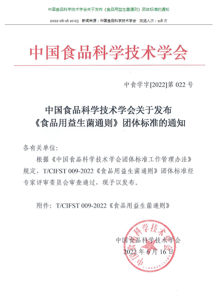 中國食品科學(xué)技術(shù)學(xué)會(huì)發(fā)布《食品用益生菌通則》團(tuán)體標(biāo)準(zhǔn)的通知