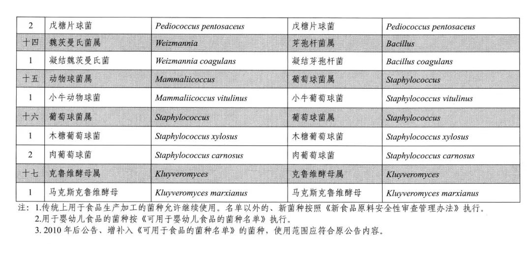 (二)根據(jù)國際有關(guān)菌種分類地位的變化情況,《可用于食品的菌種名單》及《可用于嬰幼兒食品的菌種名單》中12個菌種更新為不同種屬。