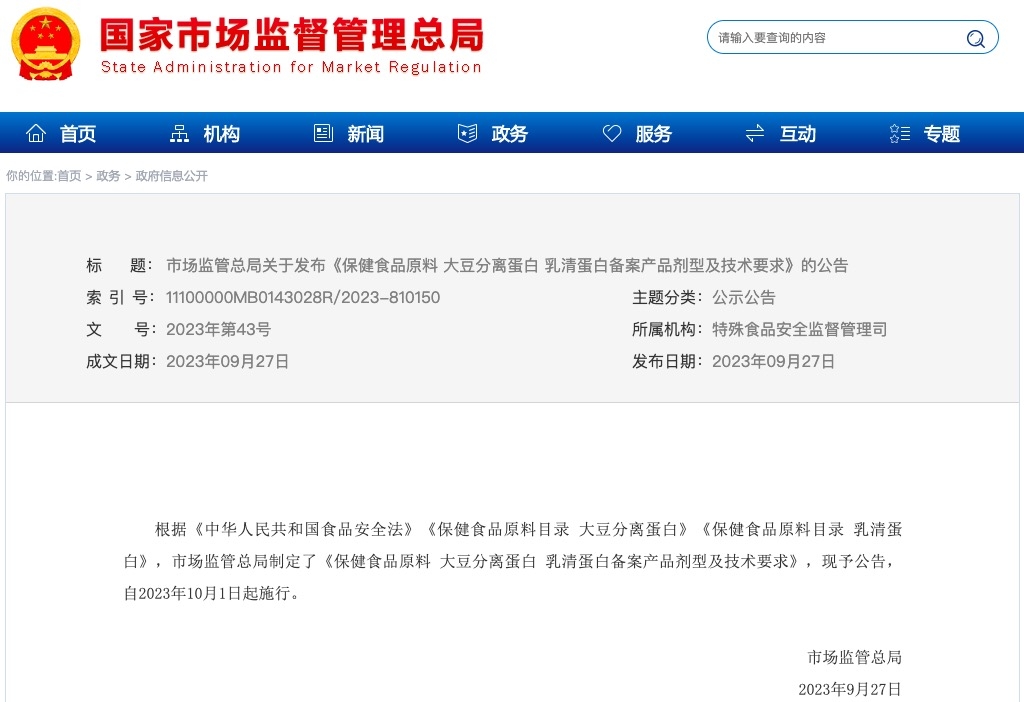 根據(jù)《中華人民共和國(guó)食品安全法》《保健食品原料目錄 大豆分離蛋白》《保健食品原料目錄 乳清蛋白》,市場(chǎng)監(jiān)管總局制定了《保健食品原料 大豆分離蛋白 乳清蛋白備案產(chǎn)品劑型及技術(shù)要求》,現(xiàn)予公告,自2023年10月1日起施行。