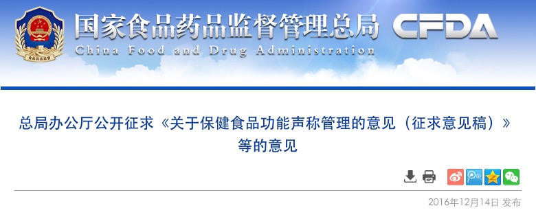 為全面貫徹落實新修訂的《中華人民共和國食品安全法》,進一步規(guī)范保健食品功能聲稱,保障消費者權(quán)益,食品藥品監(jiān)管總局研究起草了《關于保健食品功能聲稱管理的意見》(征求意見稿)以及緩解視疲勞、增強免疫力、抗氧化等3個保健功能的名稱及釋義(征求意見稿),現(xiàn)公開征求修改意見和建議。請社會各界積極參與研究并于2016年12月30日前將相關意見和建議反饋我局。