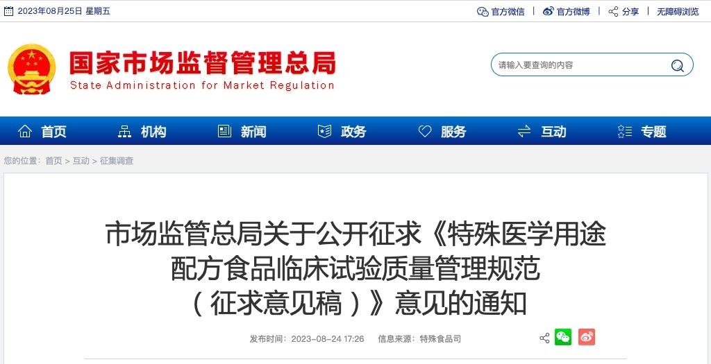 為進(jìn)一步提高特殊醫(yī)學(xué)用途配方食品臨床試驗的科學(xué)性和可操作性,市場監(jiān)管總局組織起草了《特殊醫(yī)學(xué)用途配方食品臨床試驗質(zhì)量管理規(guī)范(征求意見稿)》,現(xiàn)向社會公開征求意見,請于2023年9月24日前反饋市場監(jiān)管總局。公眾可通過以下途徑和方式提出意見: