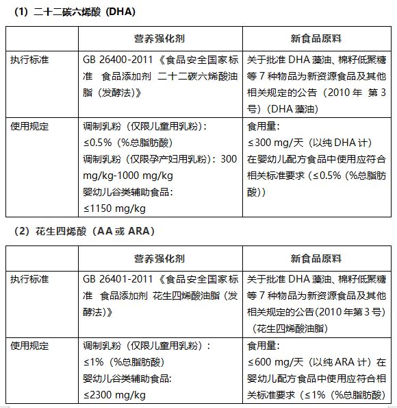 《食品營養(yǎng)強(qiáng)化劑使用標(biāo)準(zhǔn)》(GB 14880-2012)問答中指出,“對(duì)于部分既屬于營養(yǎng)強(qiáng)化劑又屬于新資源食品的物質(zhì),如二十二碳六烯酸、低聚半乳糖、多聚果糖、花生四烯酸等,如果以營養(yǎng)強(qiáng)化為目的,其使用應(yīng)符合本標(biāo)準(zhǔn)的要求;如果作為食品原料,應(yīng)符合新資源食品相關(guān)公告的規(guī)定。”