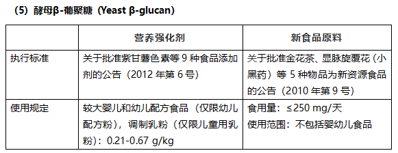 另外,依據(jù)《新食品原料安全性審查管理辦法》(2013),一種物質(zhì)已經(jīng)成功申報(bào)為營養(yǎng)強(qiáng)化劑,就不可以再申報(bào)成為新食品原料了。但相反,如果先申請(qǐng)新食品原料用于普通食品中,之后也有可能被批準(zhǔn)成為營養(yǎng)強(qiáng)化劑,例如表中所列的酵母β-葡聚糖。